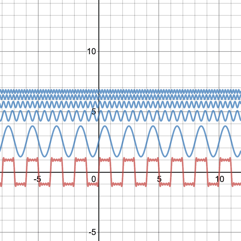 下边是周期性的占空比为50%的方波的谐波合成的desmos演示