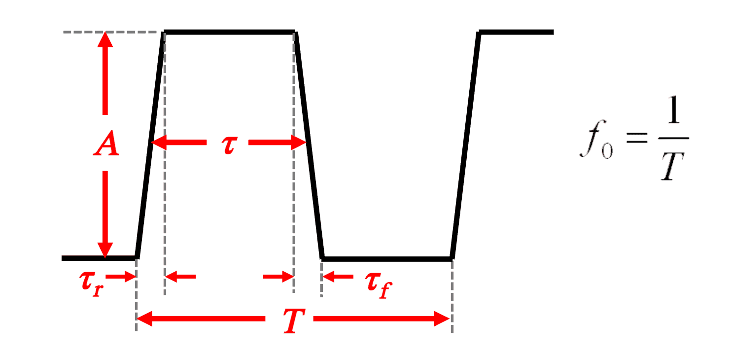 相关的参数:周期T(因此,是基频),幅度A,上升时间τr,下降时间τ f以及导通时间或脉冲宽度τ,频率f0=1/T。