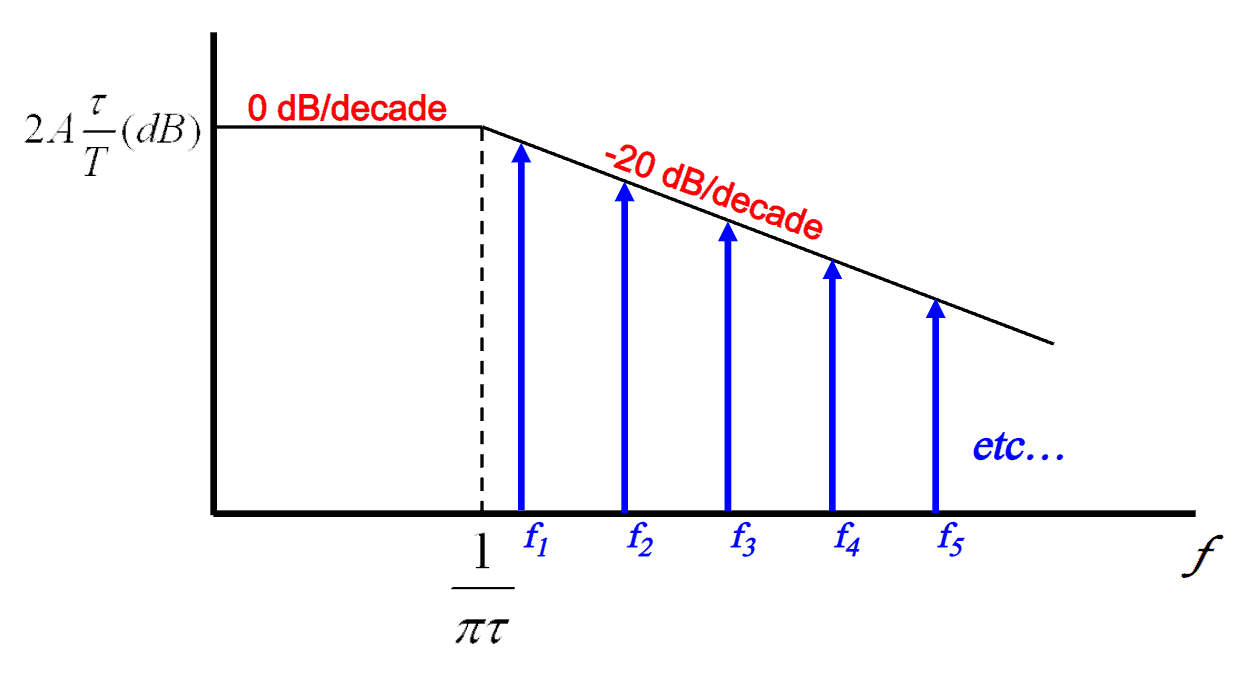观察理想方波频谱包络渐近线图,我们发现在X轴,也即标识频率的这个轴向,有个1/Πτ,(这里τ为脉冲宽度)。