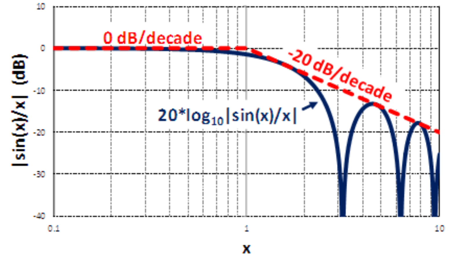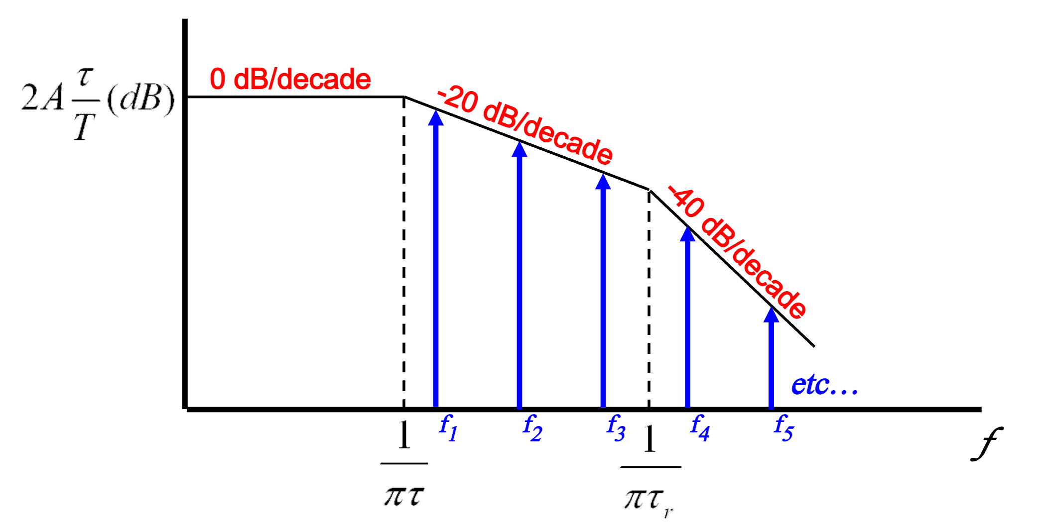 相对于理想方波的频谱,这里有两个非常有意思的拐点,一个是1/πτ,另一个是1/πτr。频谱分量的幅度经第一个转折点后以-20dB/10倍频程的速度下降,经第二转折点后以-40dB/10倍频程的速度下降。