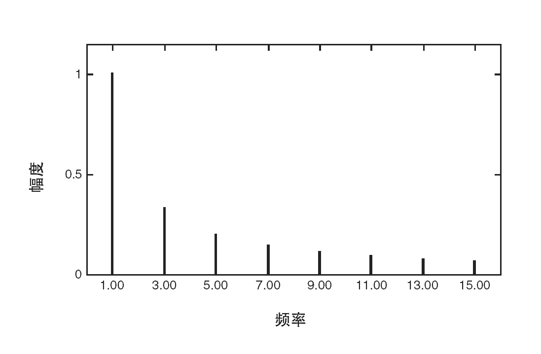 信号的傅里叶变换表示法也被称为该信号的频谱。频谱是信号的频域表示,它是用频率来描述的信号。你可以把频谱看作是信号的图形,振幅在y轴上,频率在x轴上。一个完美的理想方波的频谱如下图所示。