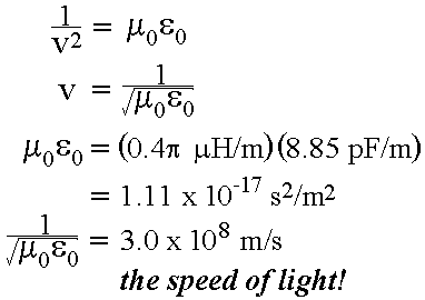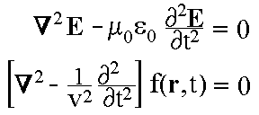 上边第一个方程是由麦克斯韦方程产生的电场的偏微分方程,第二个方程是波动方程的一般形式,其中v称为波动的相速度。比较两个方程并评估电磁波的相速度: